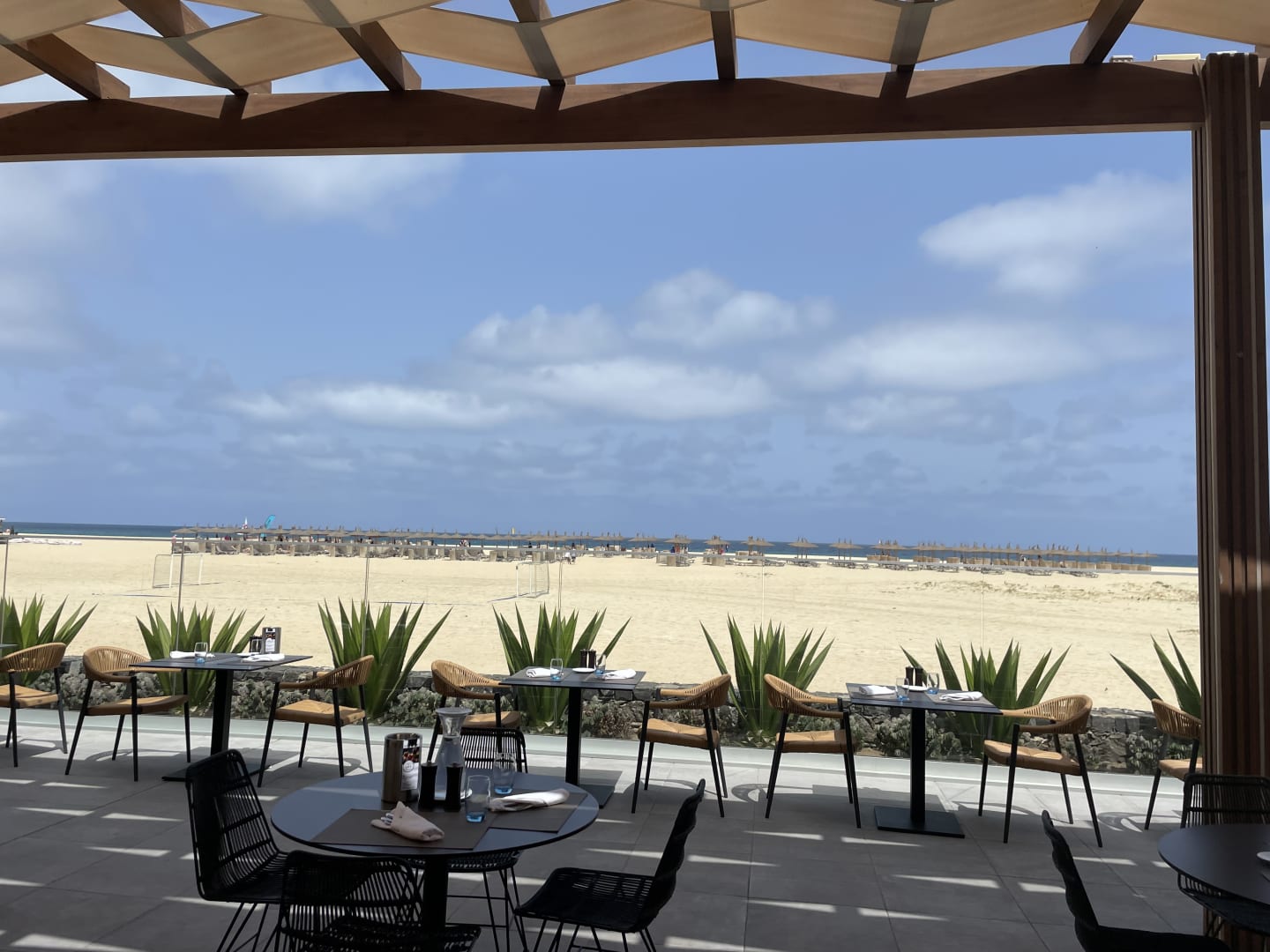 Blick aus der Hauptbar auf den Strand