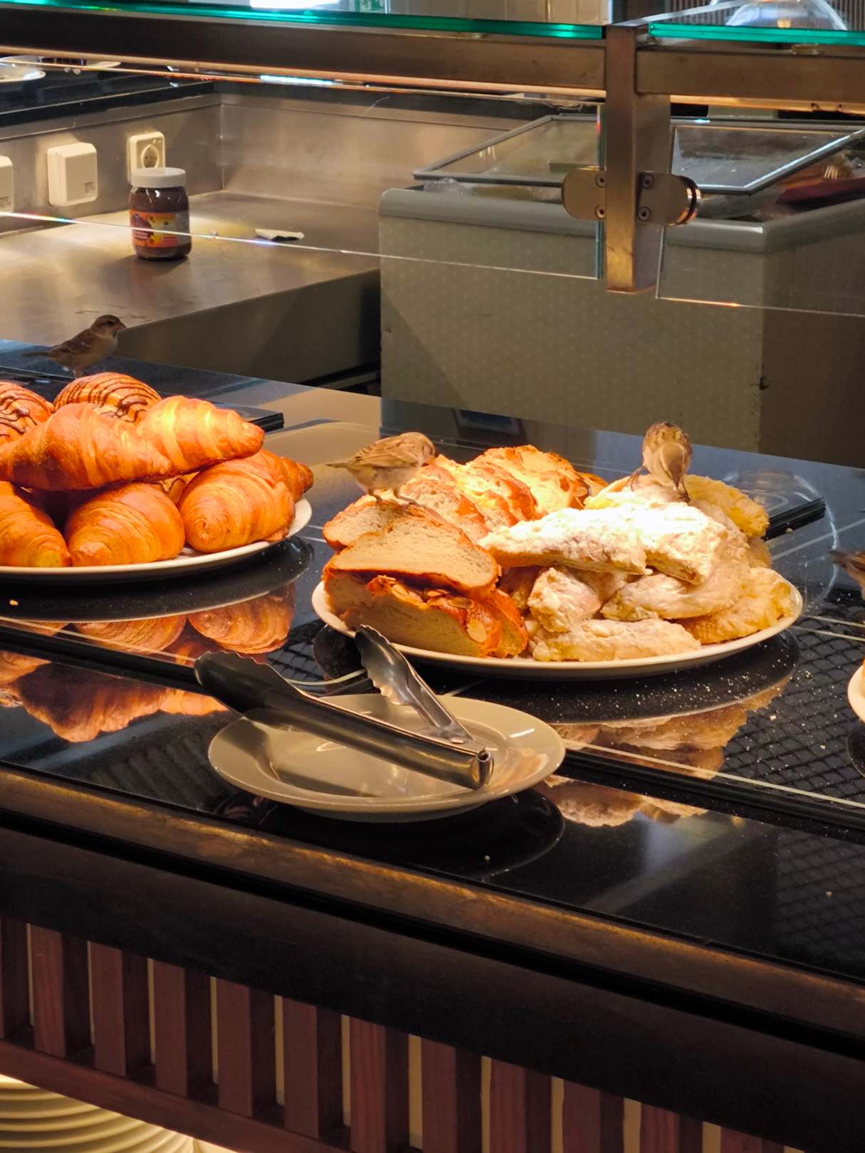 Vögel auf den Speisen am Buffet (Im Restaurant)