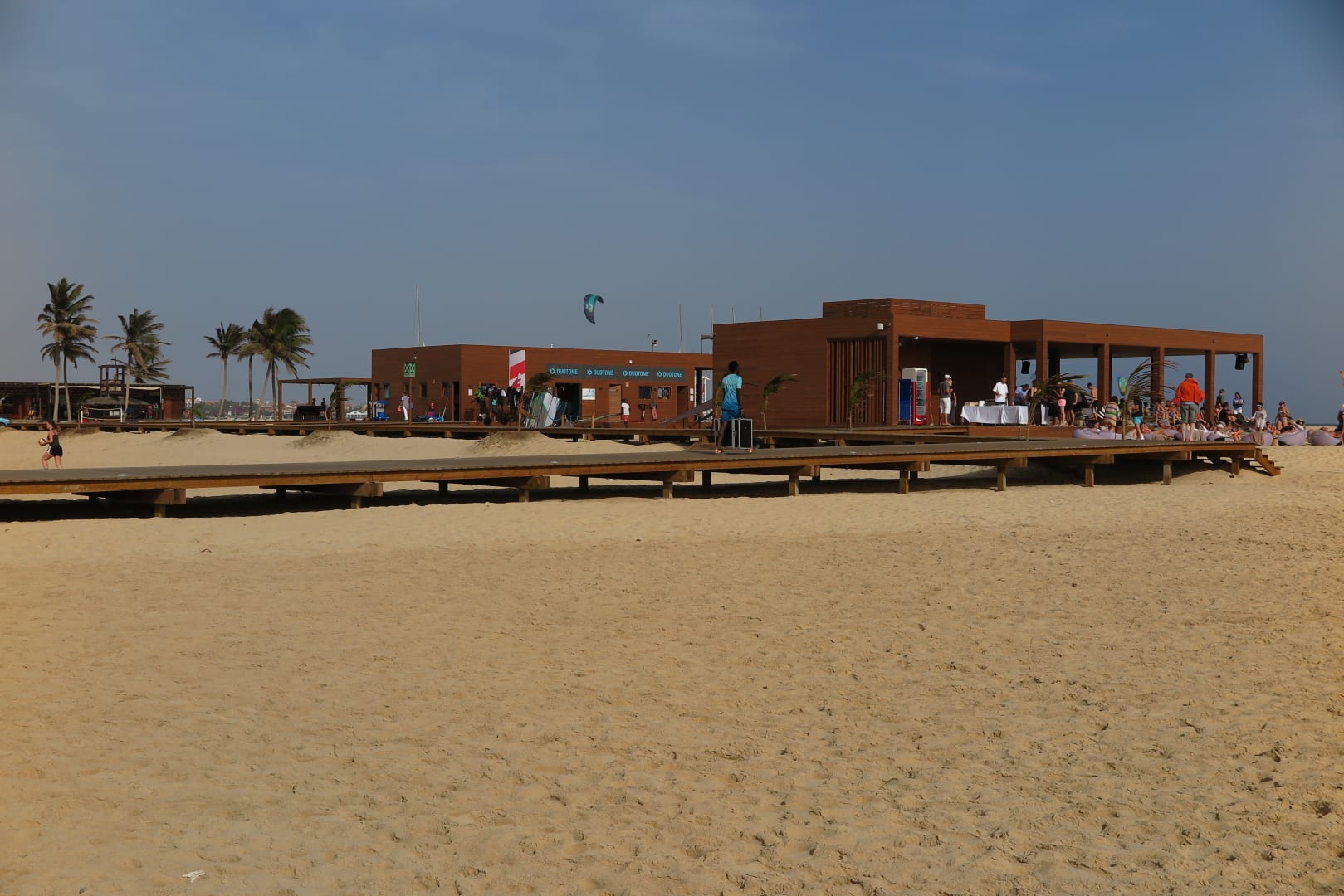 StrandBlick auf die immer belebte Beachbar (rechtes Gebäude) & die Wassersportstation (links daneben)