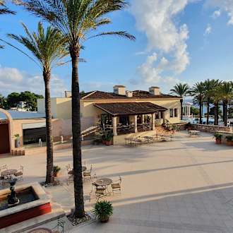 Blick vom Außenbereich des Restaurants. Ganz rechts kann man auch einen der zwei Pool erkennen