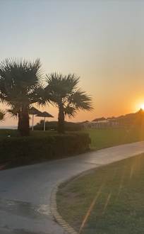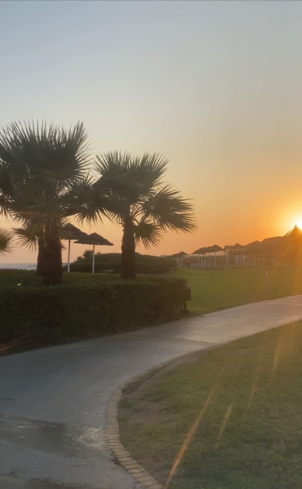 Strand und Garten zum Sonnenuntergang
