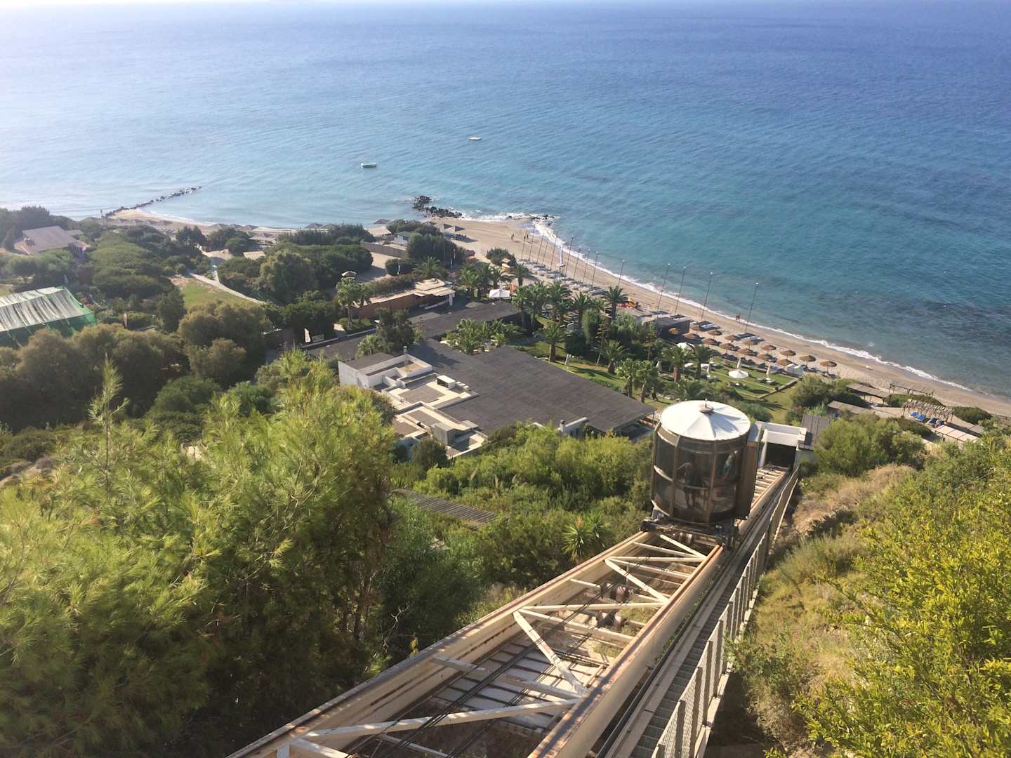 Ausblick von oben (Aufzug) runter zum Strand und Wassersportcenter (links unten)