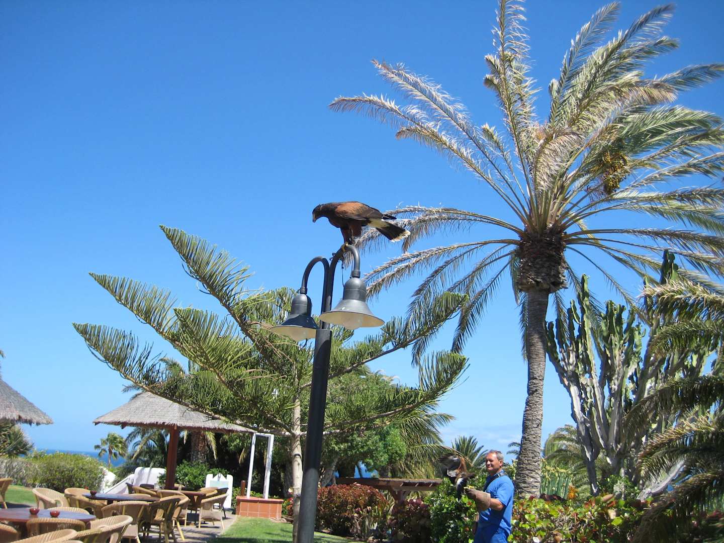 Die 2 Bussarde des Robinson Clubs Esquinzo Playa fliegen zur Abschreckung von Tauben fast täglich ihre Runden über die Clubanlage