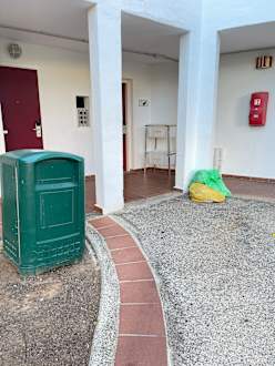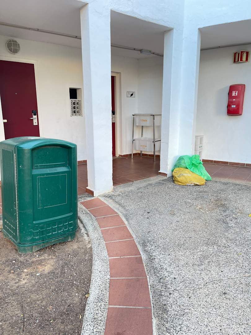Müllcontainer, Flaschenabgabe und zwischen gelagerte Mülltüten vor meinem Zimmer.