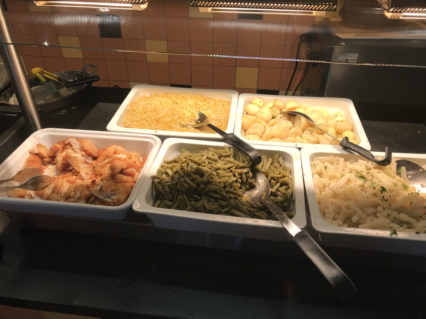 Beilagen und Fisch (vorne links)