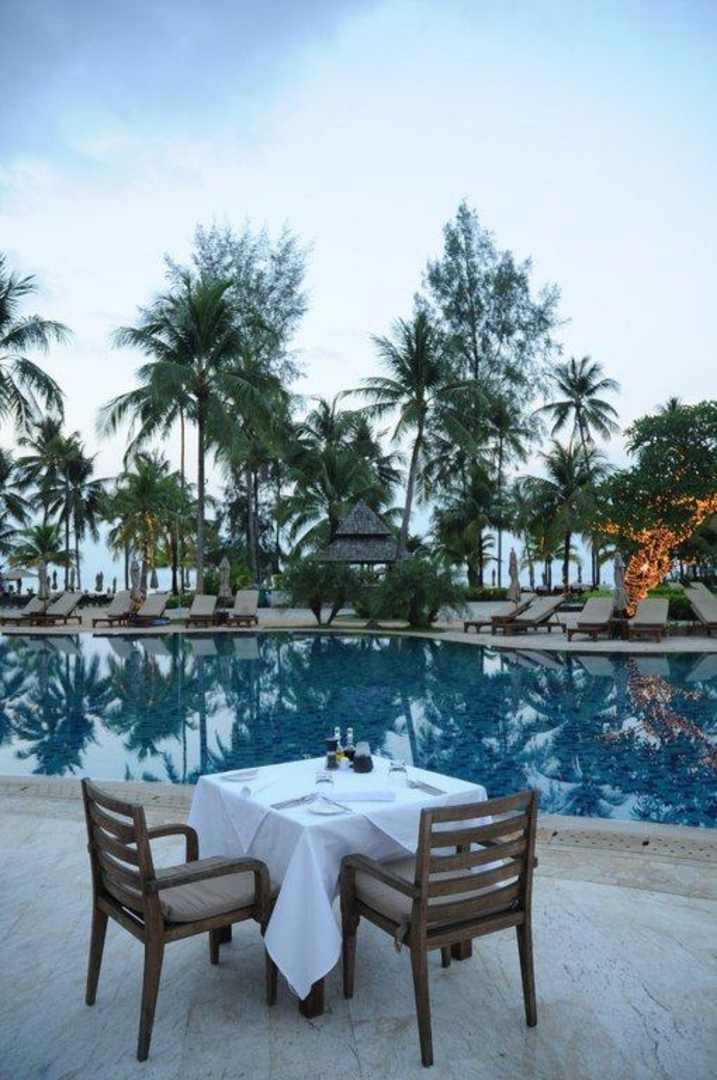 Das Bild zeigt kein Arrangement fürs Foto, sondern eine der Tische vom Spezialitätenrestaurant am Pool kurz vor dem Abendessen.