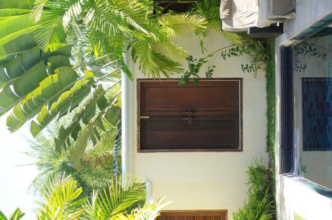 Die Tür am Ende des Pools kann man öffnen, dann hat man Blick in den Garten der Anlage.