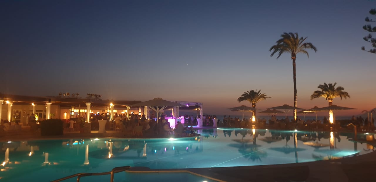 Blick von der Beachbar bei Nacht auf den Pool