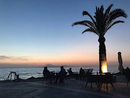 Terrasse an der Poolbar nach Sonnenuntergang mit Blick auf Kefalonia