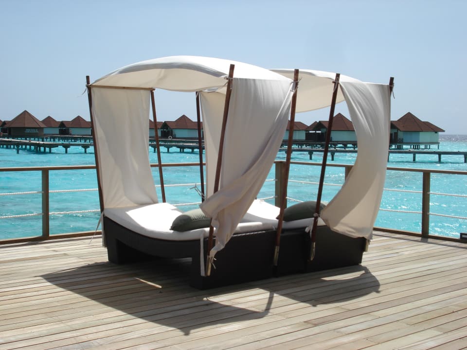 Tolle Liegen mit Blick auf die Wasserbungalows