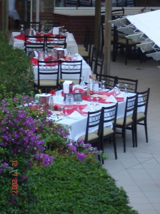 Blick auf den Restaurant-AussenbereichJeden Abend sind die Tische auf andere Art und Weise wunderschön eingedeckt