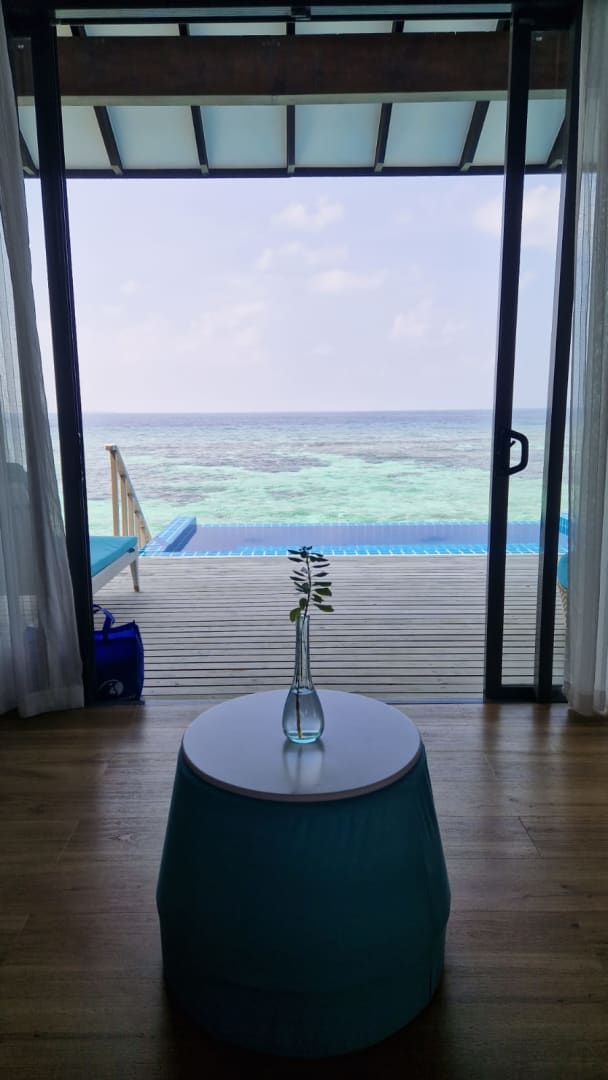 Ausblick aus dem Wasserbungalow auf den Pool sowie das Meer