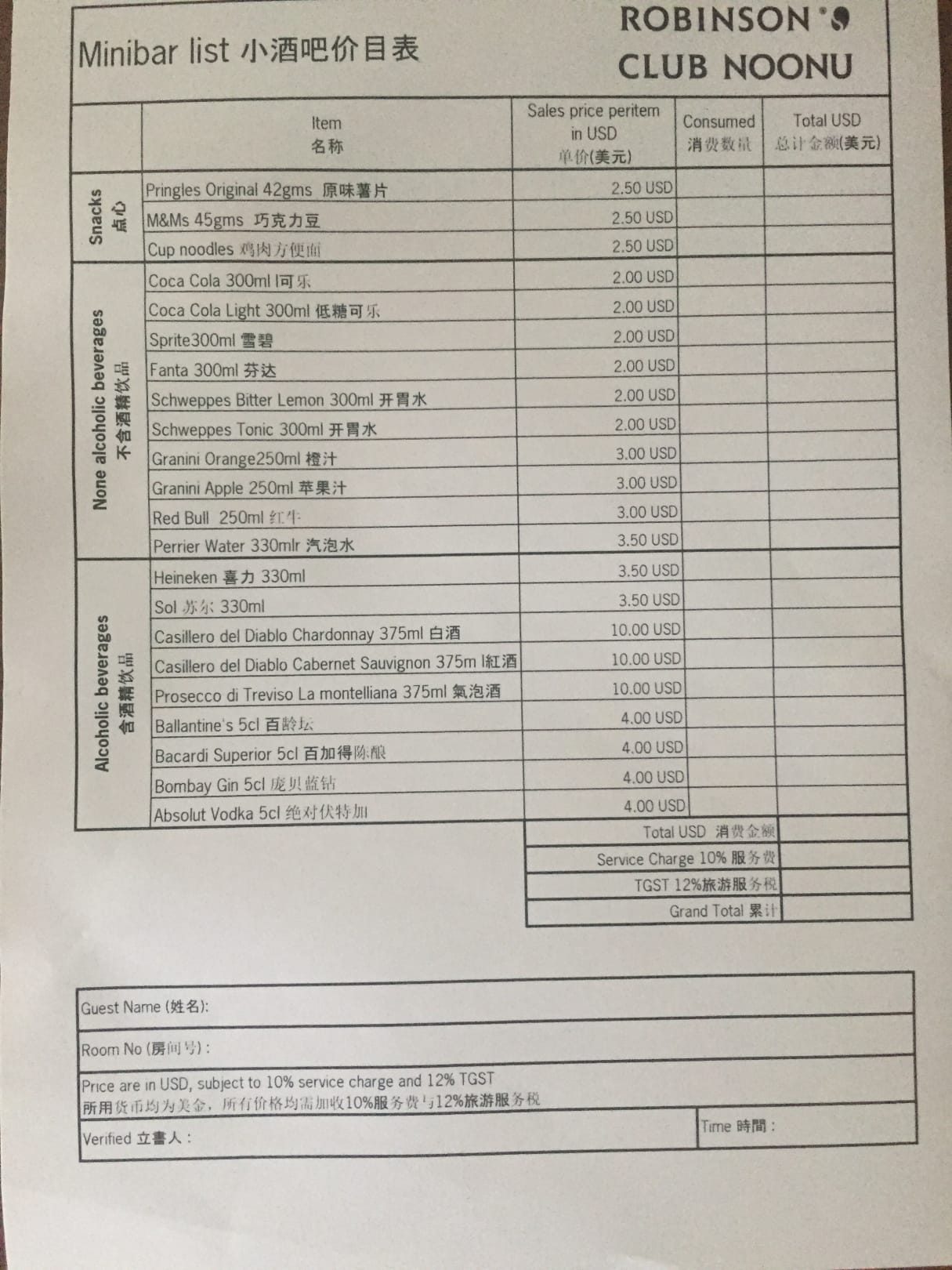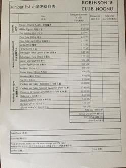 Preisliste Minibar, die nicht all-inclusive ist