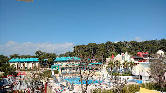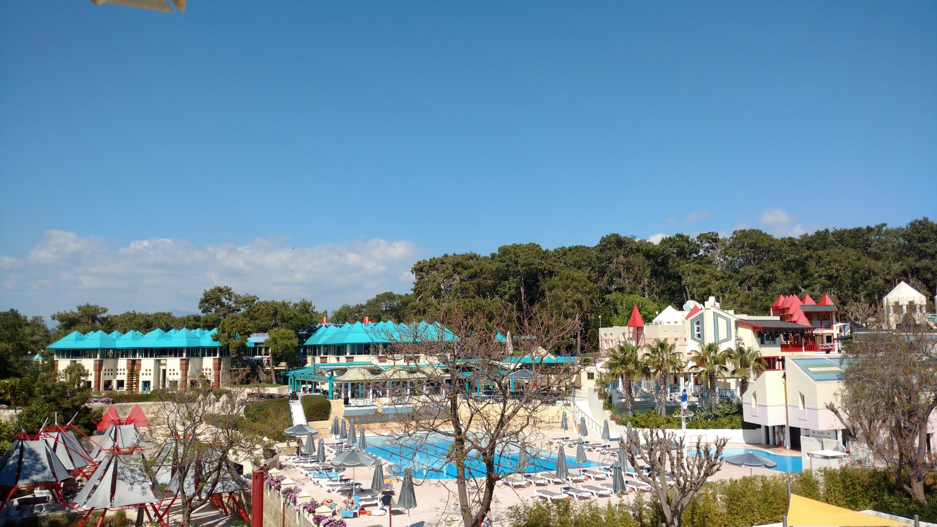 PoolSportpool, Nite-Club (links unten) und Restaurant mit Bar (blaue Dächer), rechts daneben Theater vom Turm der Rutsche aus.