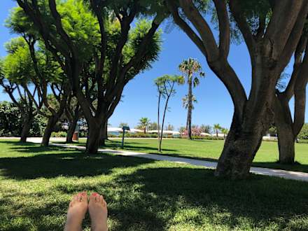 Schattiger Garten mit Blick aufs Meer
