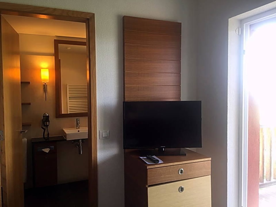DoZi, Fernseher, Minibar und Blick ins Bad