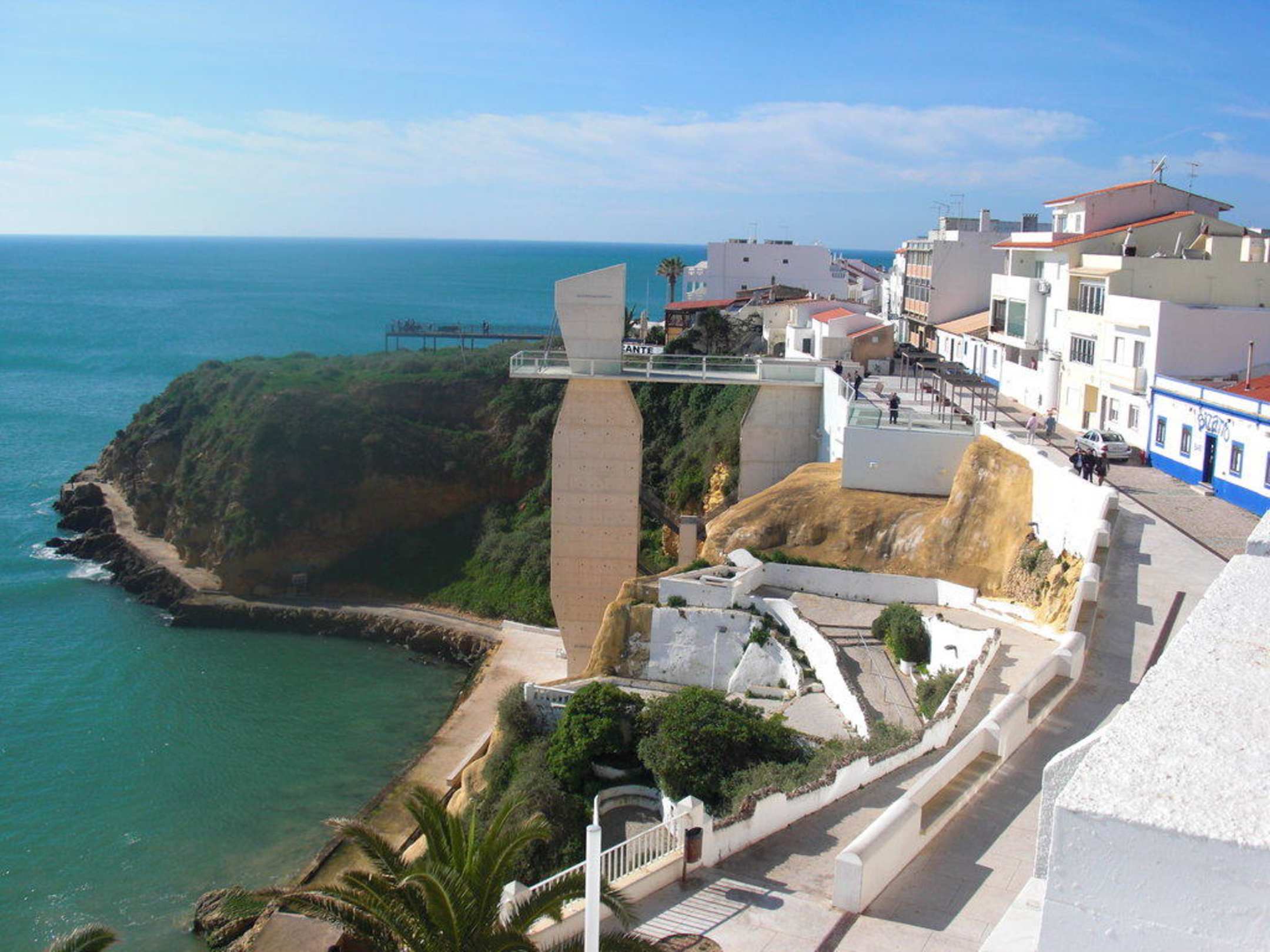 Rechts der Aufzug der einen zum Strand bringt, falls man nicht die Treppe (wenige Stufen) steigen möchte.