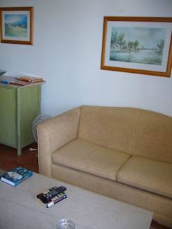 Schlafsofa im Wohnzimmer mit Sonnencreme und sonstigen Resten