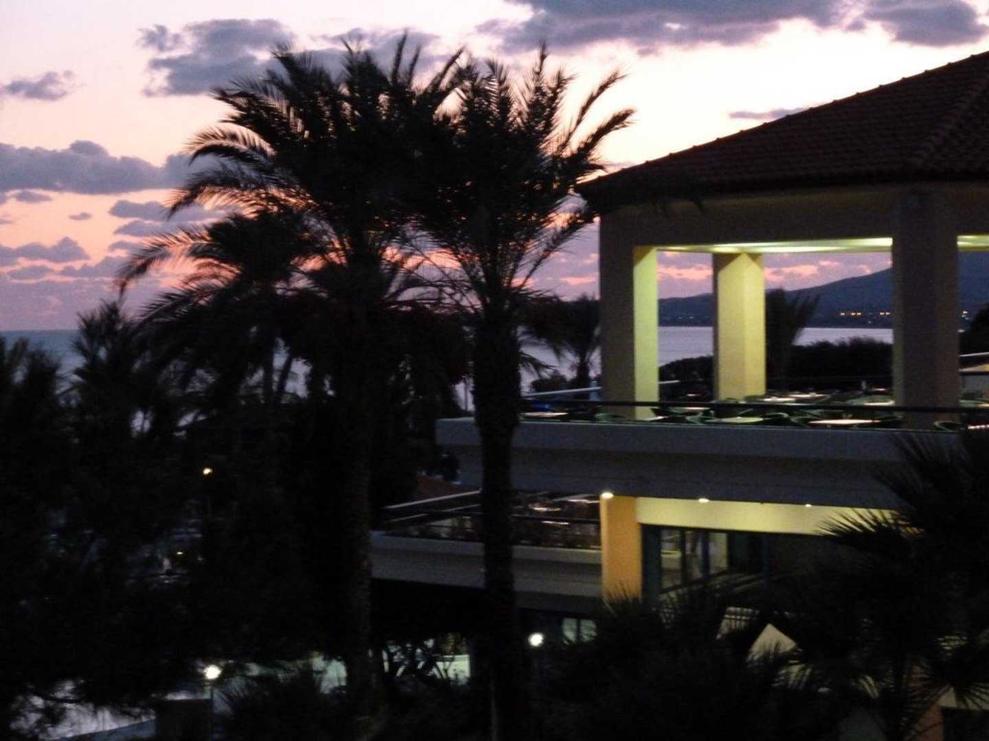 Blick vom Balkon auf die Barterrasse am Abend
