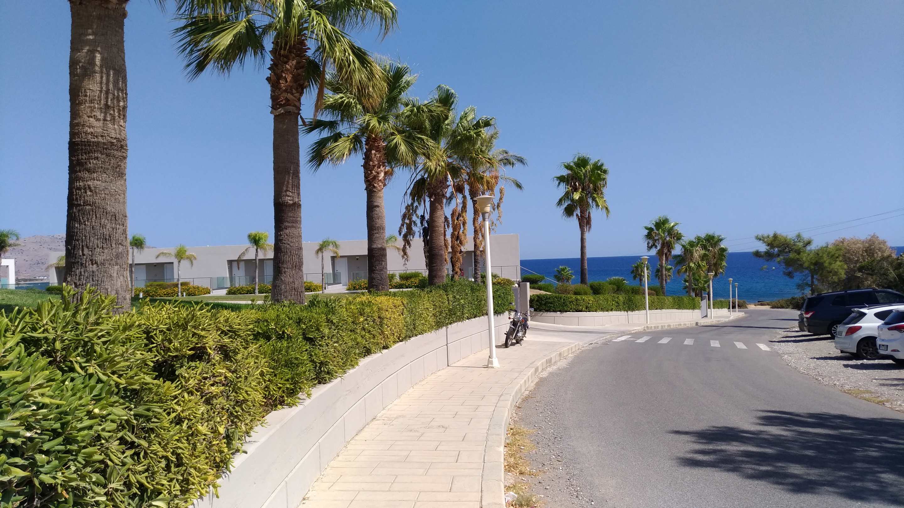 Straße zwischen Hotel und Meer. Wenig Verkehr