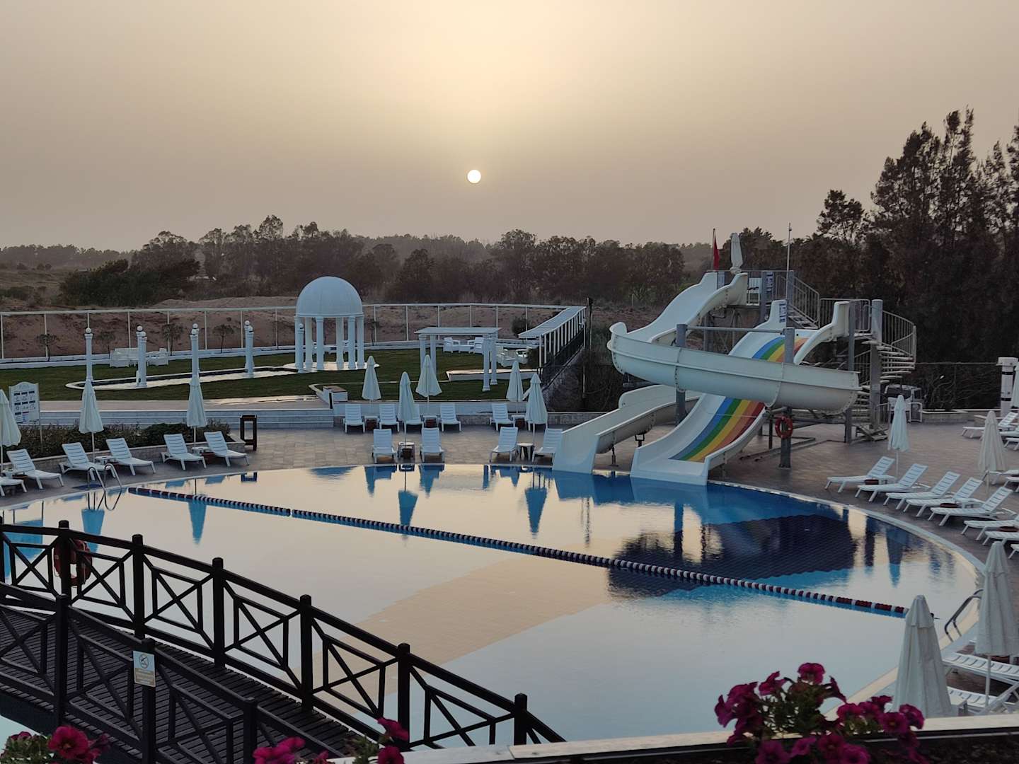 Von der Dachterrasse mit Blick über den Pool zum Sonnenuntergang