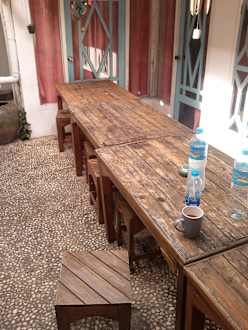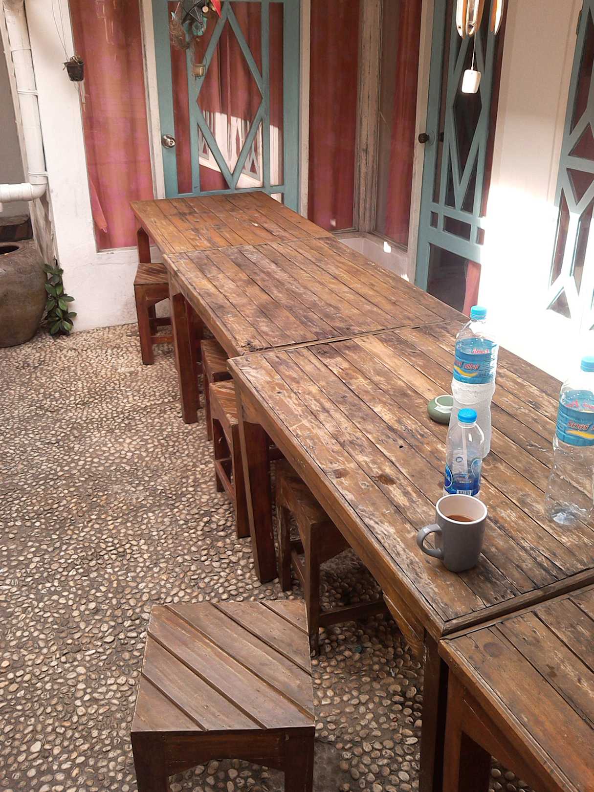 Tische und Sitzhocker am Pool
