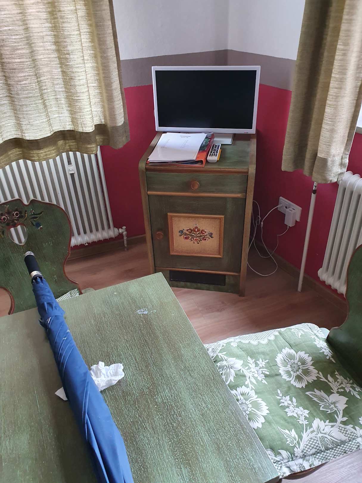 Angeblicher großer Flachbildschirm- Als Sitzgelegenheit zwei harte Stühle, wo man naxch wenigen Minuten Schmerzen gekam. Sonst keine Sitzgeöegenheit, nur noch auf dem Bett.