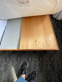 Hier sieht man deutlich das Holzbrett unter der Matratze. Darunter lag ein Lattenrost.