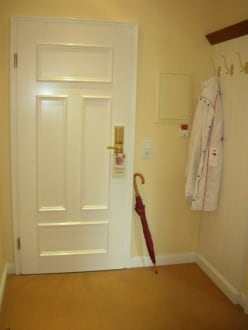 Flur, mit Blickrichtung zur Zimmertür. Der Regenschirm gehört auch mit zur Suite.