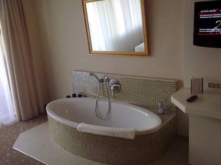 Hier haben wir die Zwei-Personen Badewanne. Sie steht frei im Raum und man kann mit Blick auf den LCD oder aus dem Fenster baden.