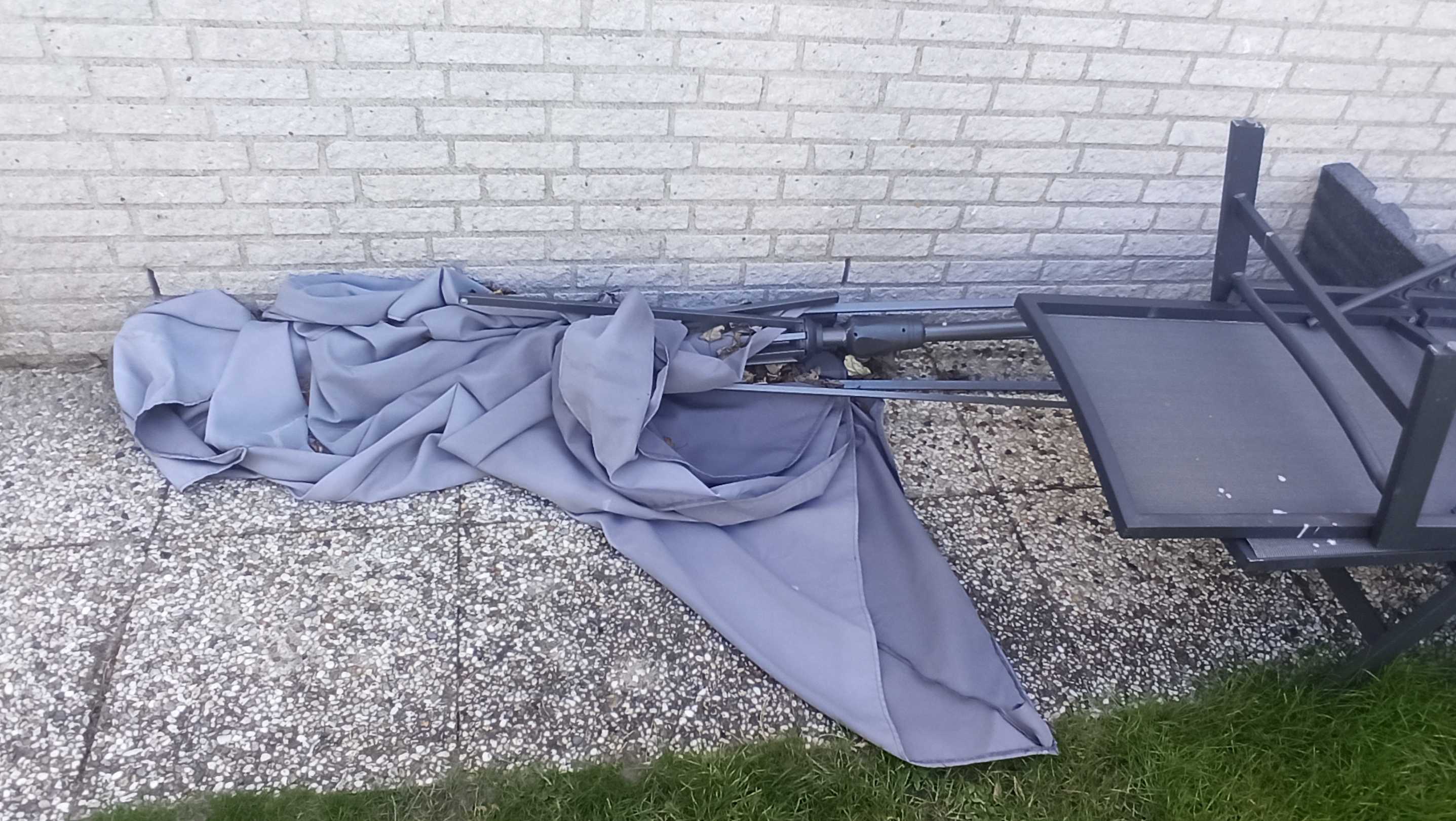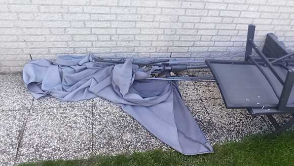 Sonnenschirm total defekt, Stühle stehen verschmutzt und chaotisch herum