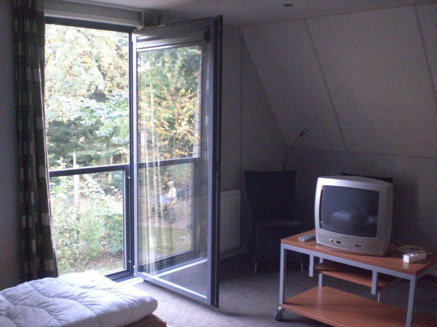 oberes Schlafzikmmerlinks 2 sep. Betten, großes Fenster, 2. TV, Kleiderschrank und ein Babybett i.d. Ecke