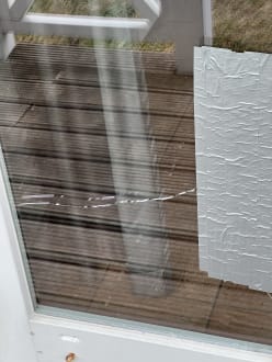 zerbrochene Scheibe mit Klebestreifen "repariert"