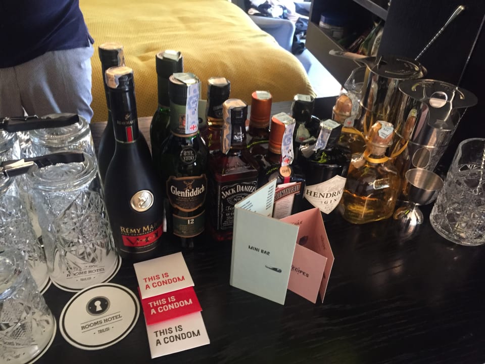 Minibar mit Flaschen in ordentlicher Größe. Und mit Gummis :-P