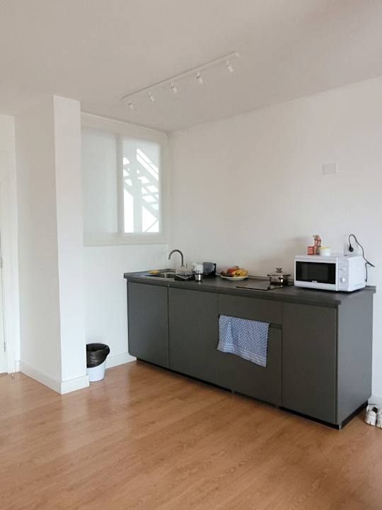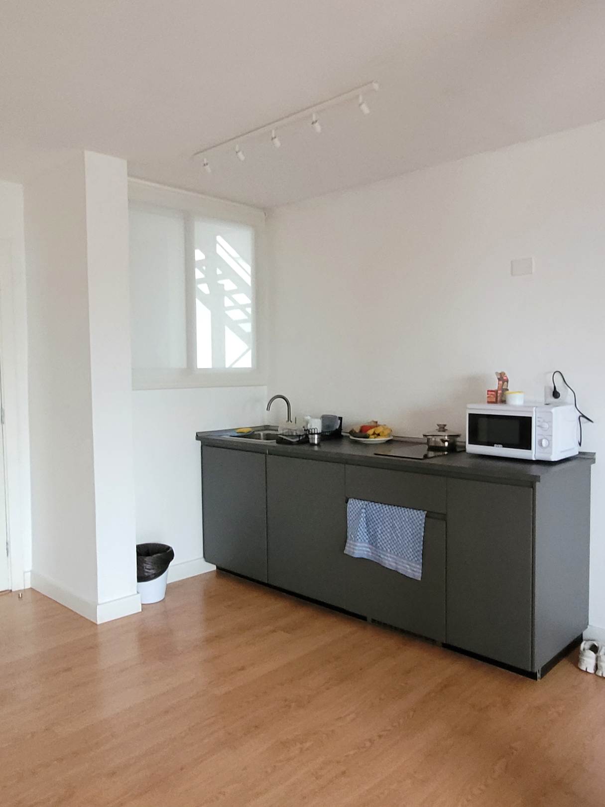 Kühlschrank mit Gefrierfach, 2-Platten Induktionsherd und Mikrowelle. Ausreichend Geschirr