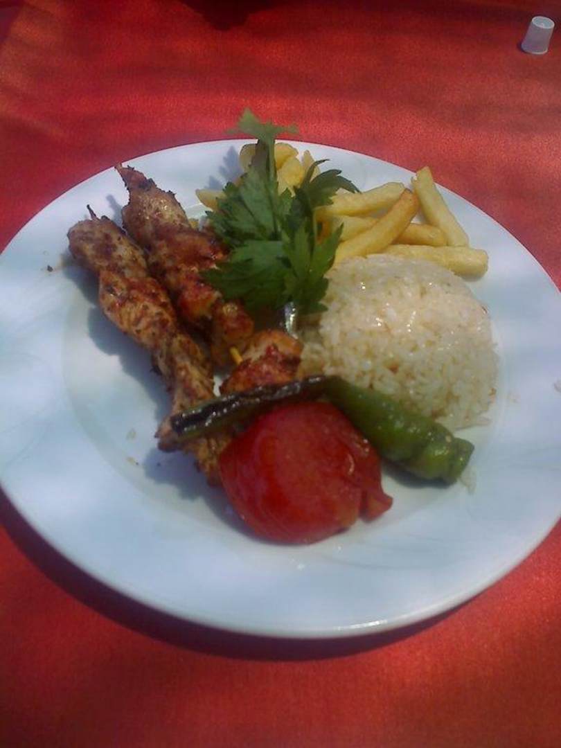 Hähnchenspieß mit Beilage,leckerPommes kann man sich am Buffet nachholen. Die Majo und der Ketschup steht auch da.