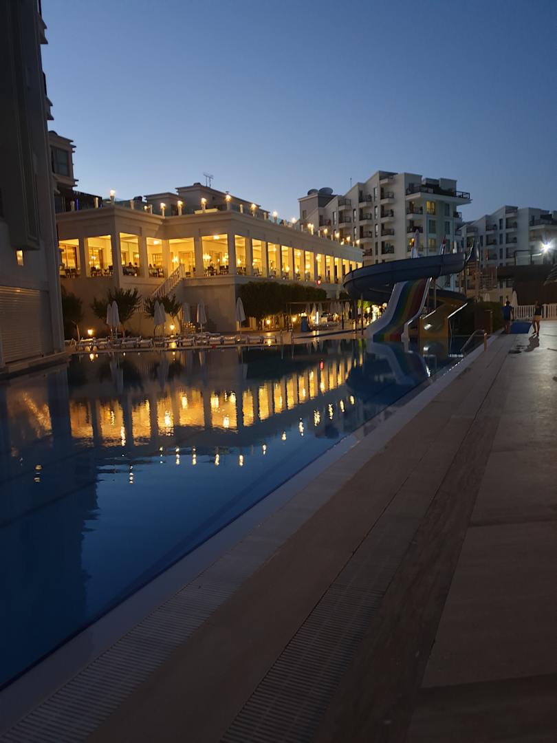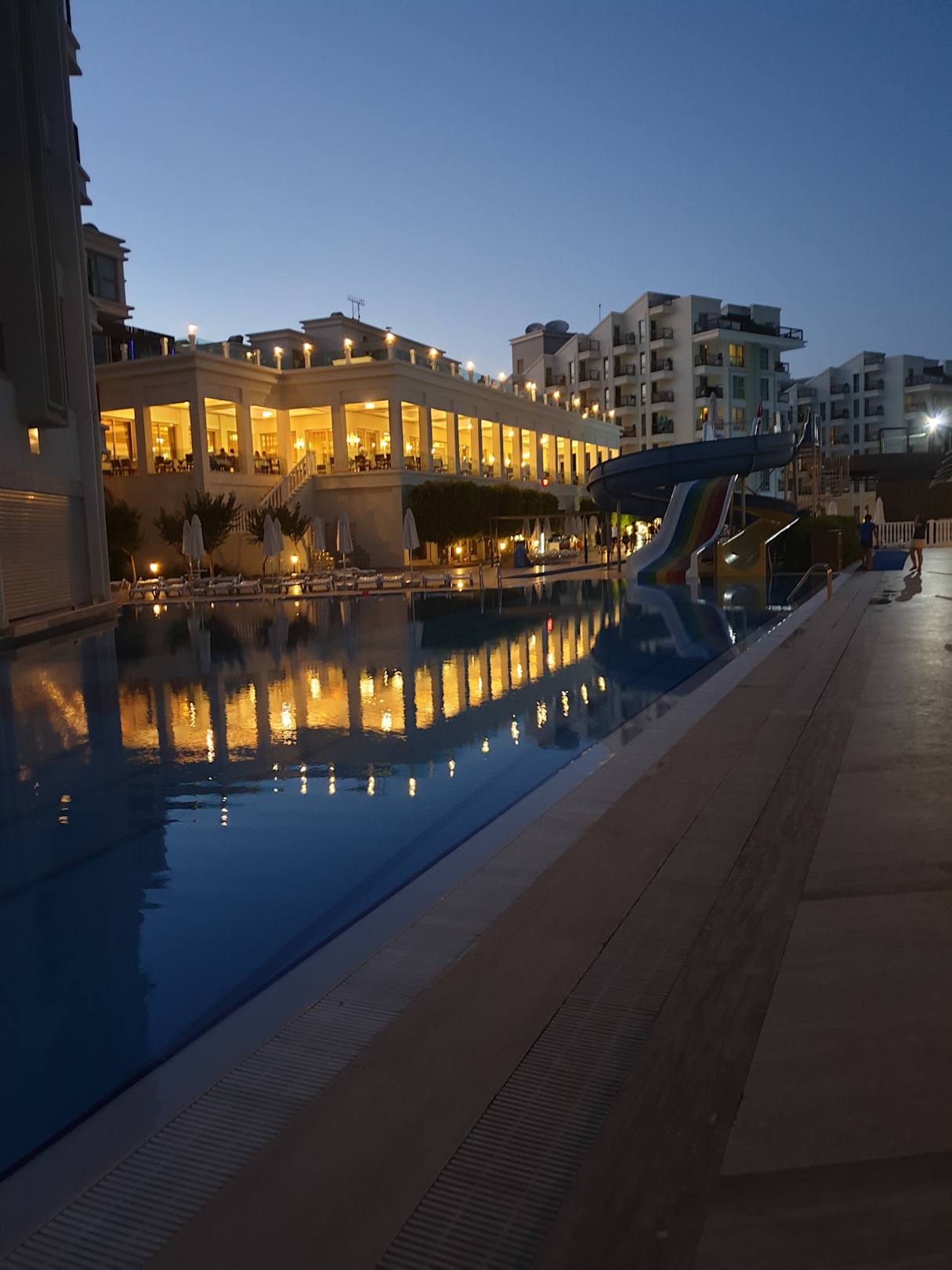 Pool mit Blick auf Hauptrestaurant und das Hotel