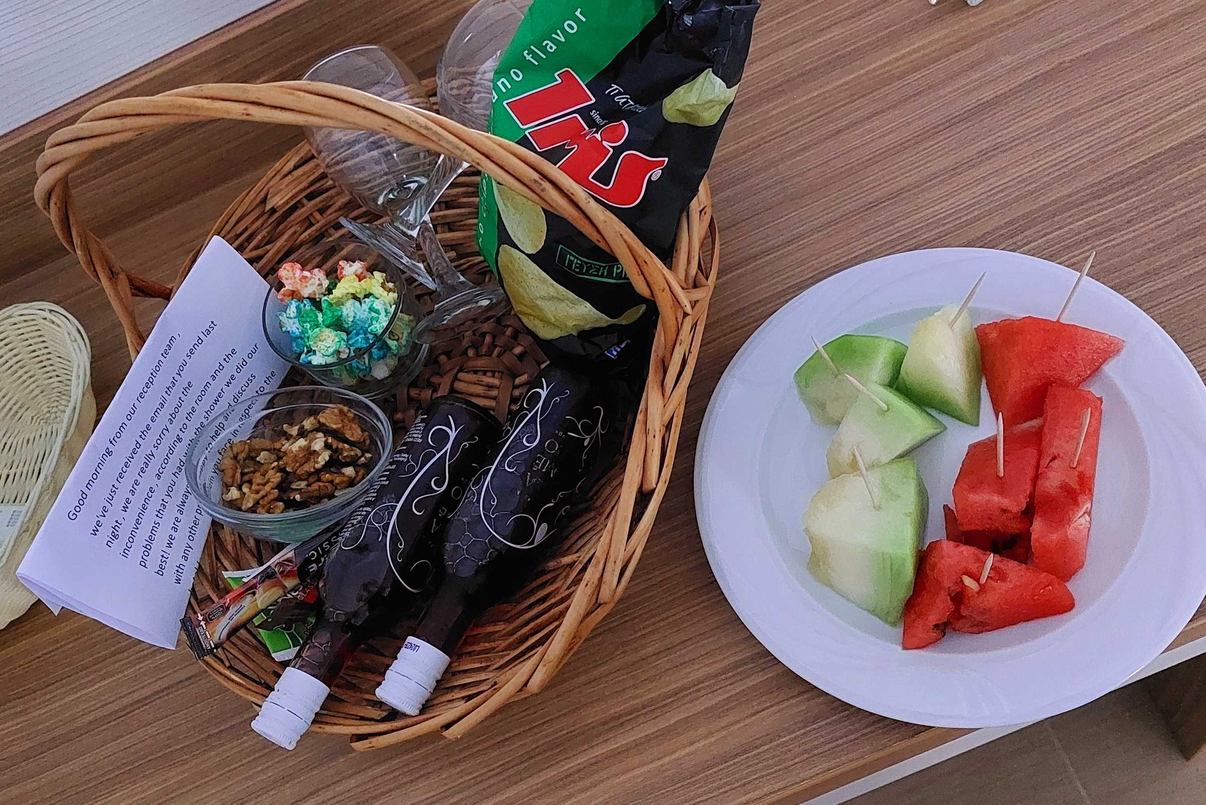 SonstigesAls Entschuldigung für ständig fehlende Handtücher, defekte Toilette, Dusche und nach einer Info Mail ans Hotel, das es schade ist, das keinerlei Entschuldigung für die Unannehmlichkeiten kam, heute ein Korb mit Wein, Süßigkeiten, Obst und Brief. DANKE