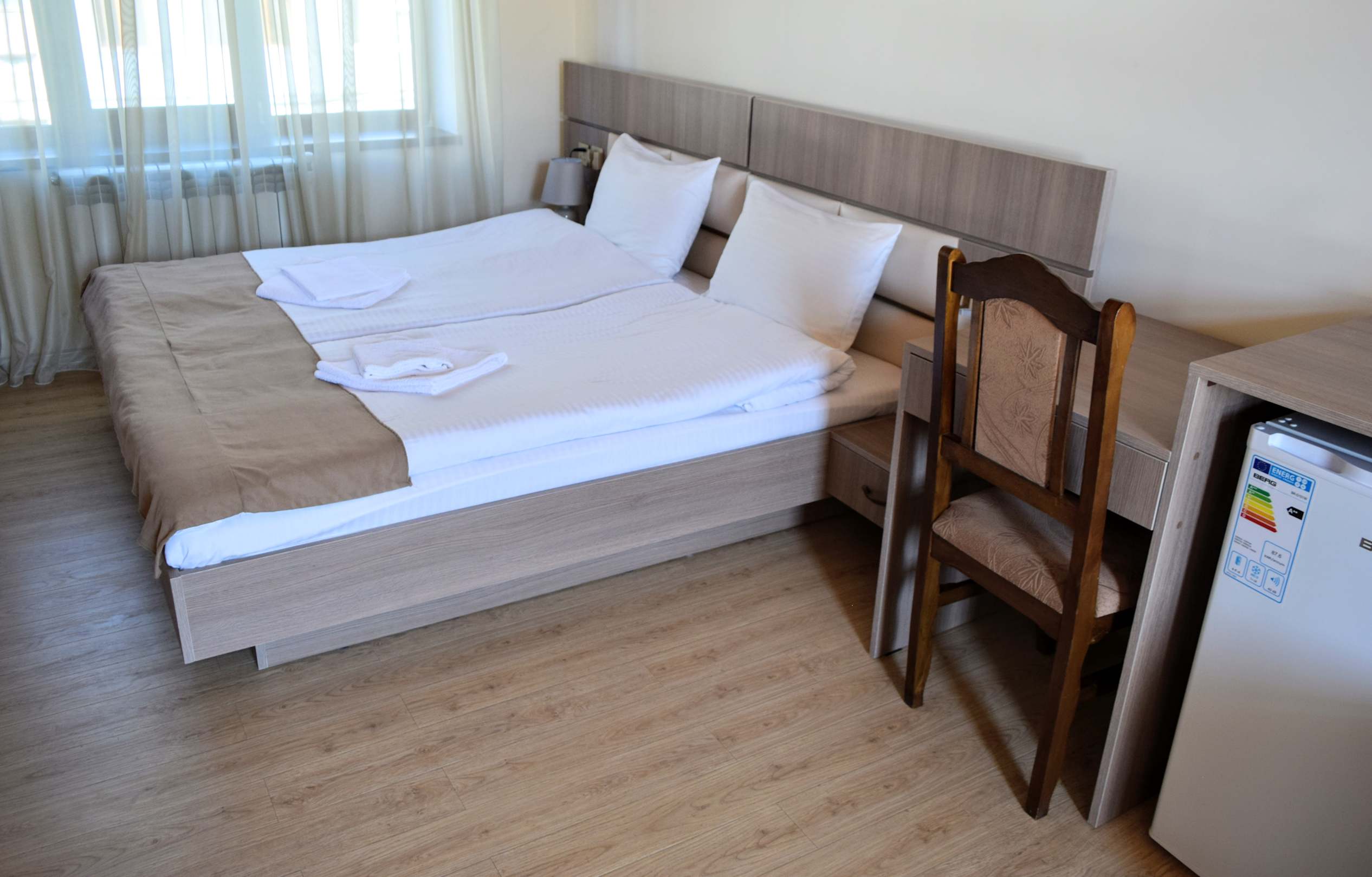 Bett, Schreibtisch mit Stuhl und Kühlschrank im Zimmer...