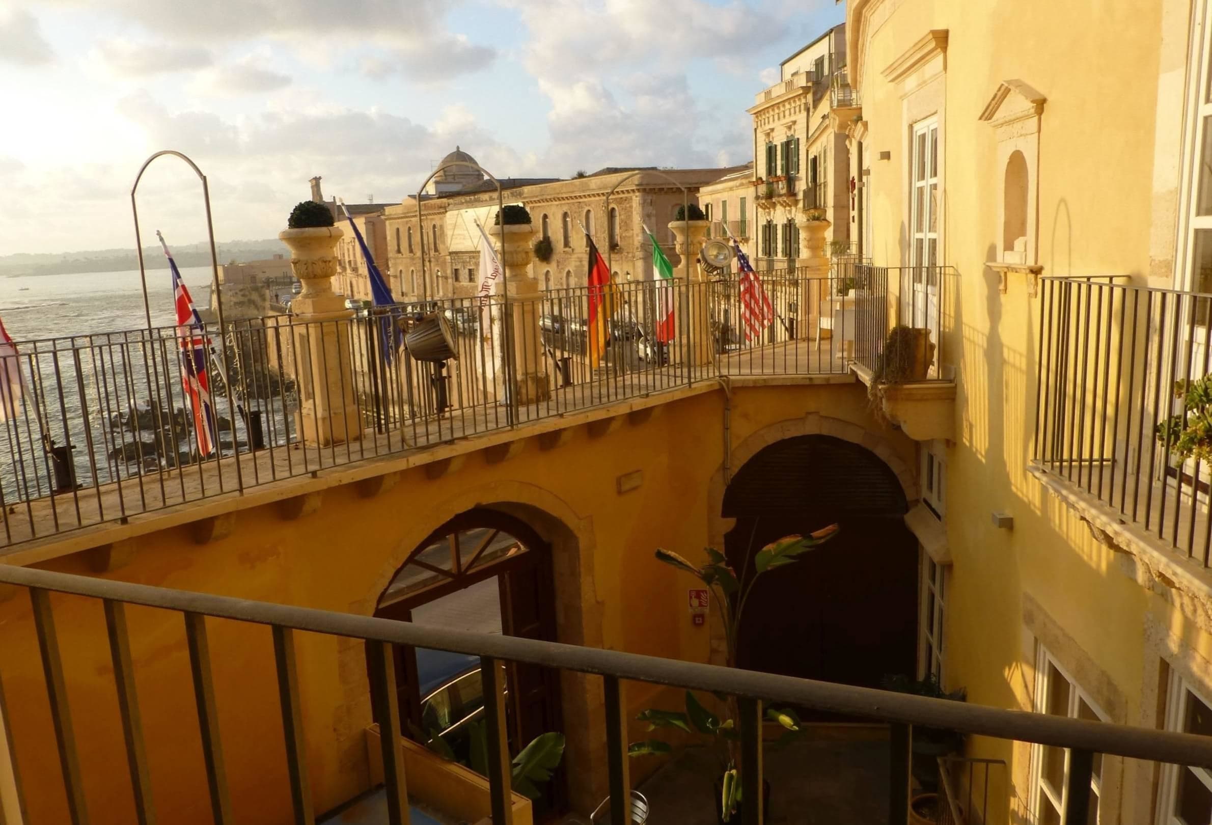 Blick auf Hotelfassade und Meer