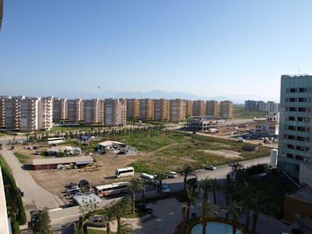 Ausblick vom Balkon nach links, auf Hochhäuser und eine Baustelle. Einziger schöner Ausblick: Die Gipfel des Taurusgebirges im Hintergrund.