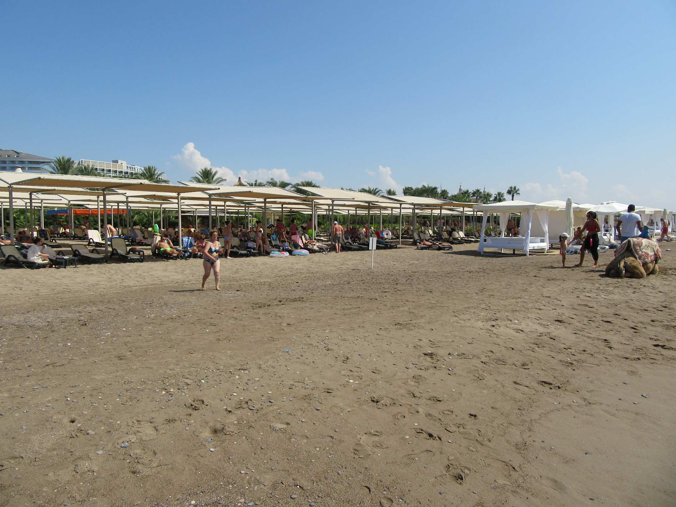 Schöner Sandstrand mit großen Sonnensegeln