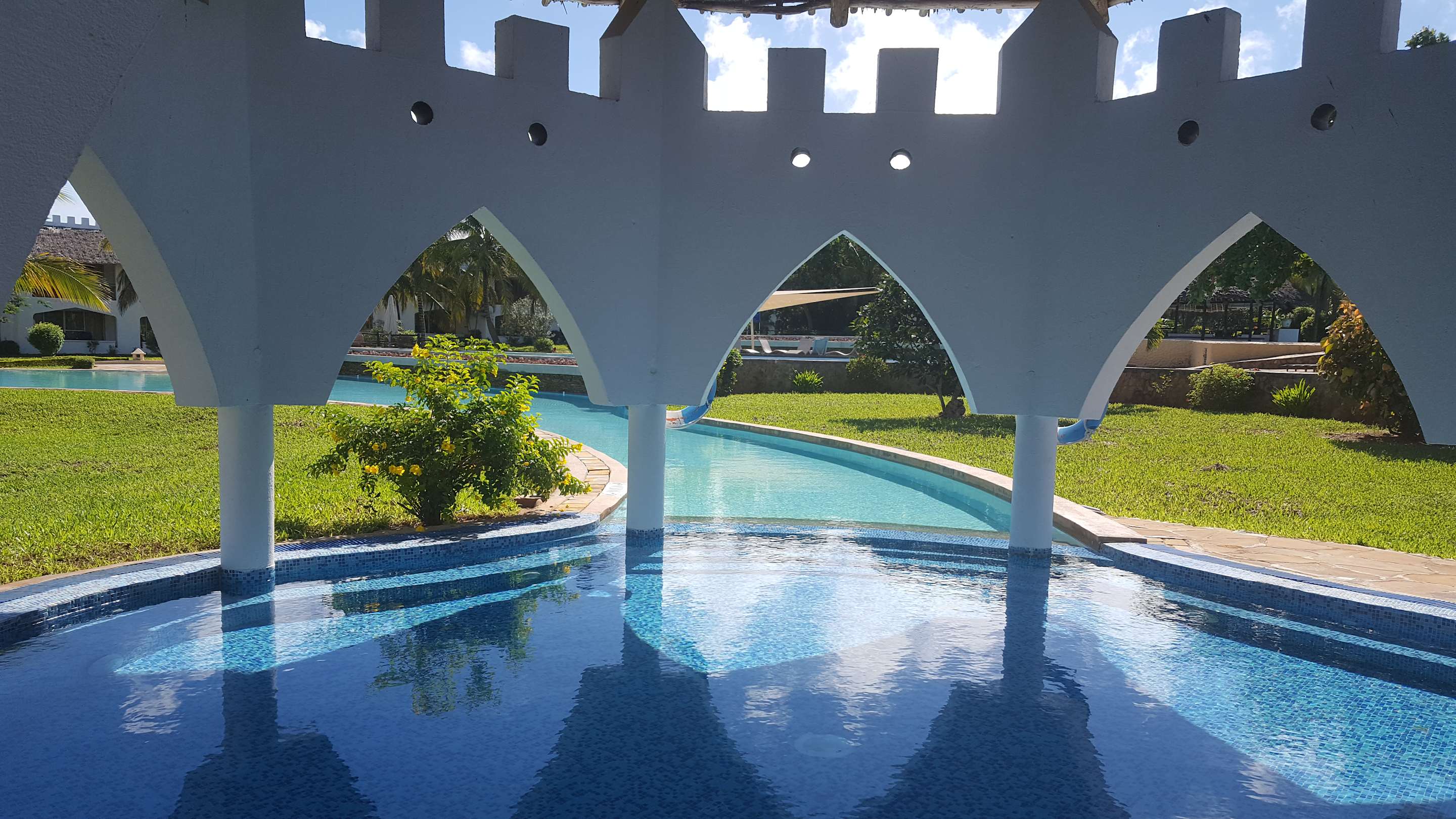 oberer Pool-Bereich mündet in einen überdachten Whirl-Pool