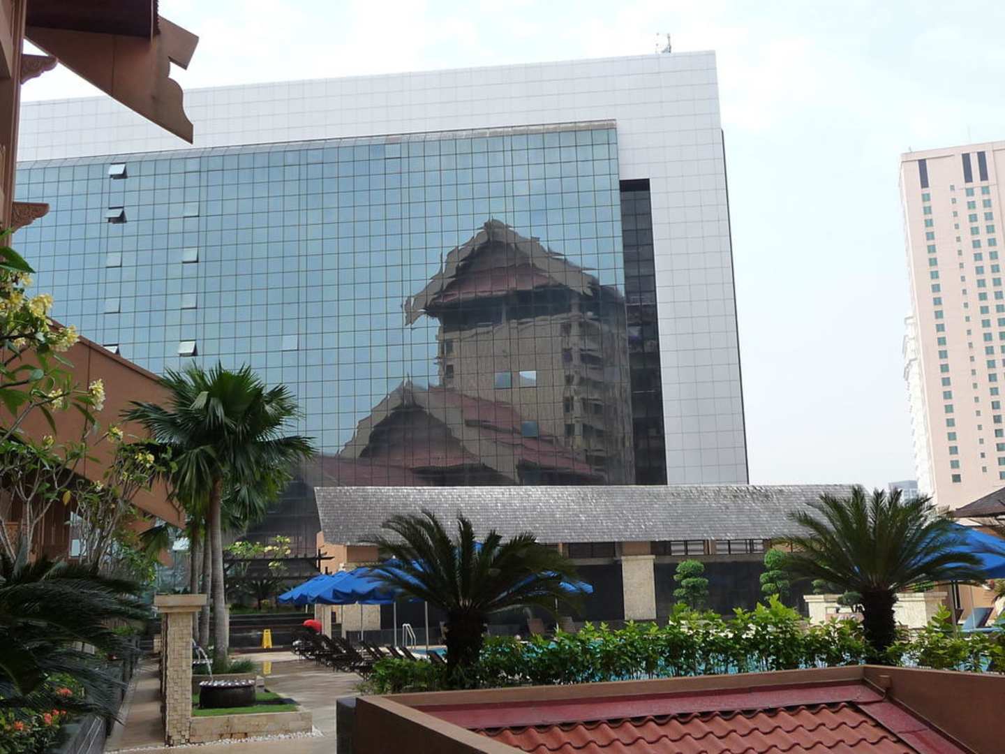 Ausblick vom Pool zum Nachbarhaus - Spiegelbild unser Hotel.