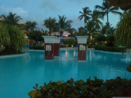 Hier sieht man die Poolanlage in der abendlichen Dämmerung