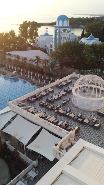 Blick vom Zimmer auf Terrasse und Pool