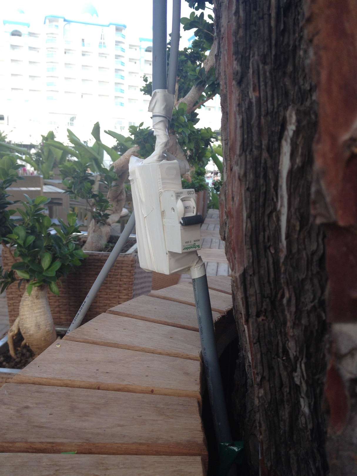 Hier sieht man eine kreative Möglichkeit die Beleuchtung in den Bäumen bei einer der Bars zu schalten. Nicht nur unschön, sondern auch gefährlich in Anbetracht der vielen kleinen Gäste.