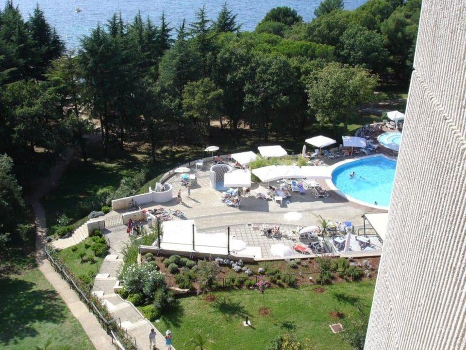 Blick auf den Pool und das Meer vom Zimmer im Hotel Ribin
