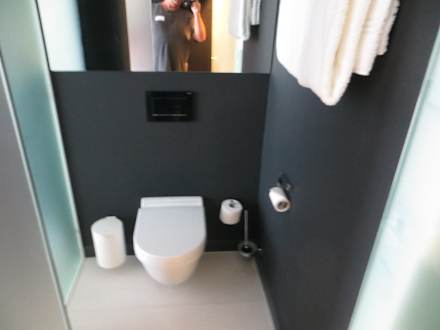 Die kleine Toilette mit Handtüchern für die Dusche nebenan