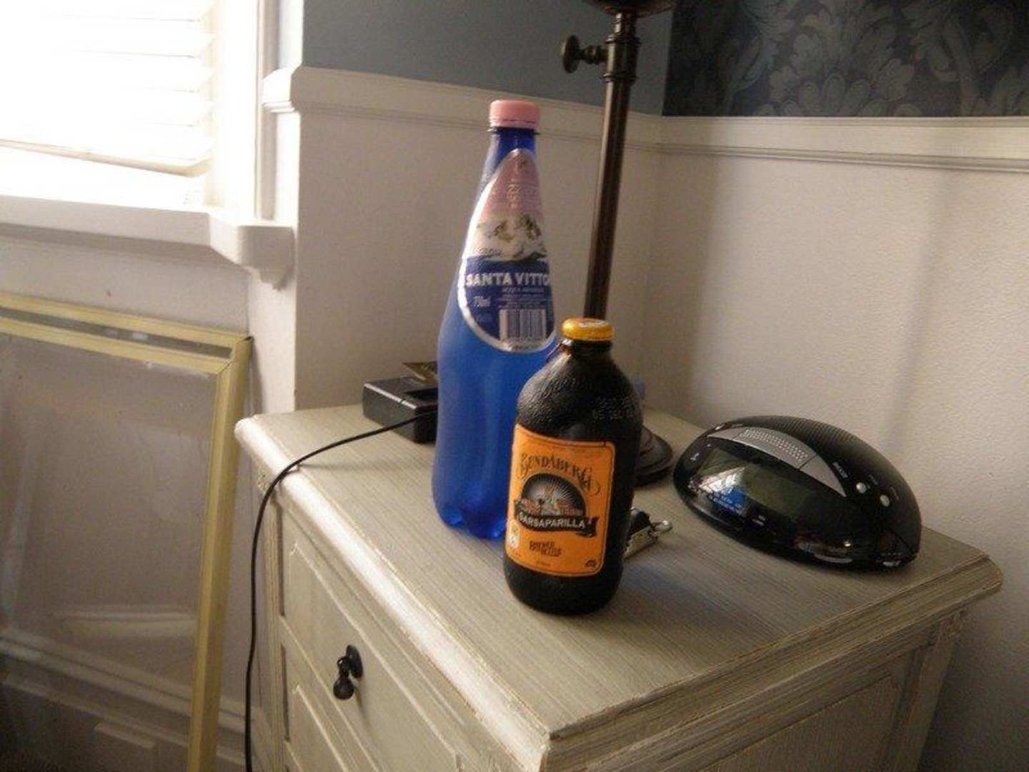 Stolik nocny, zegarek z budzikiem i radiem